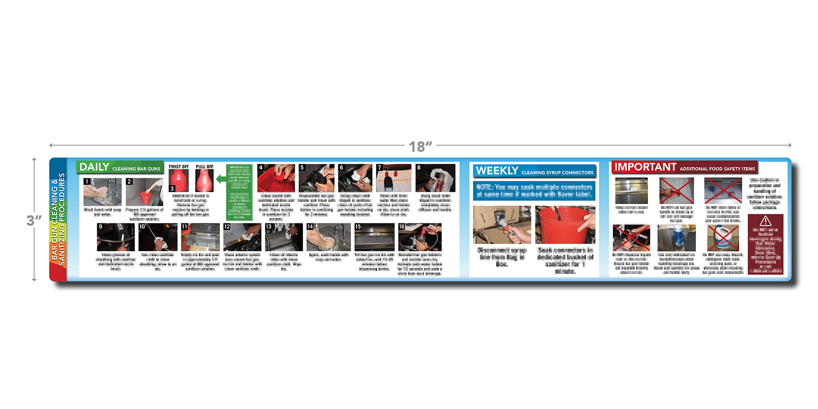 3″ H x 18″ W decal with daily, weekly and additional important food safety procedures for cleaning and sanitizing the bar gun.