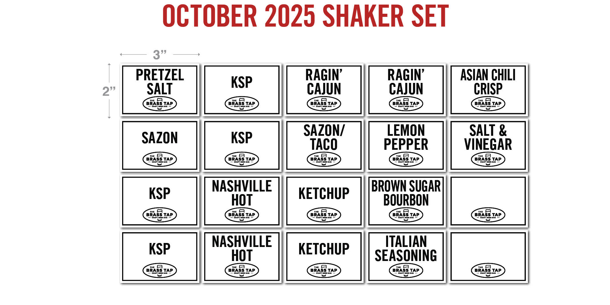 Set of 20 Shaker Labels for the OCTOBER 2025 Menu. Includes 2 blanks.