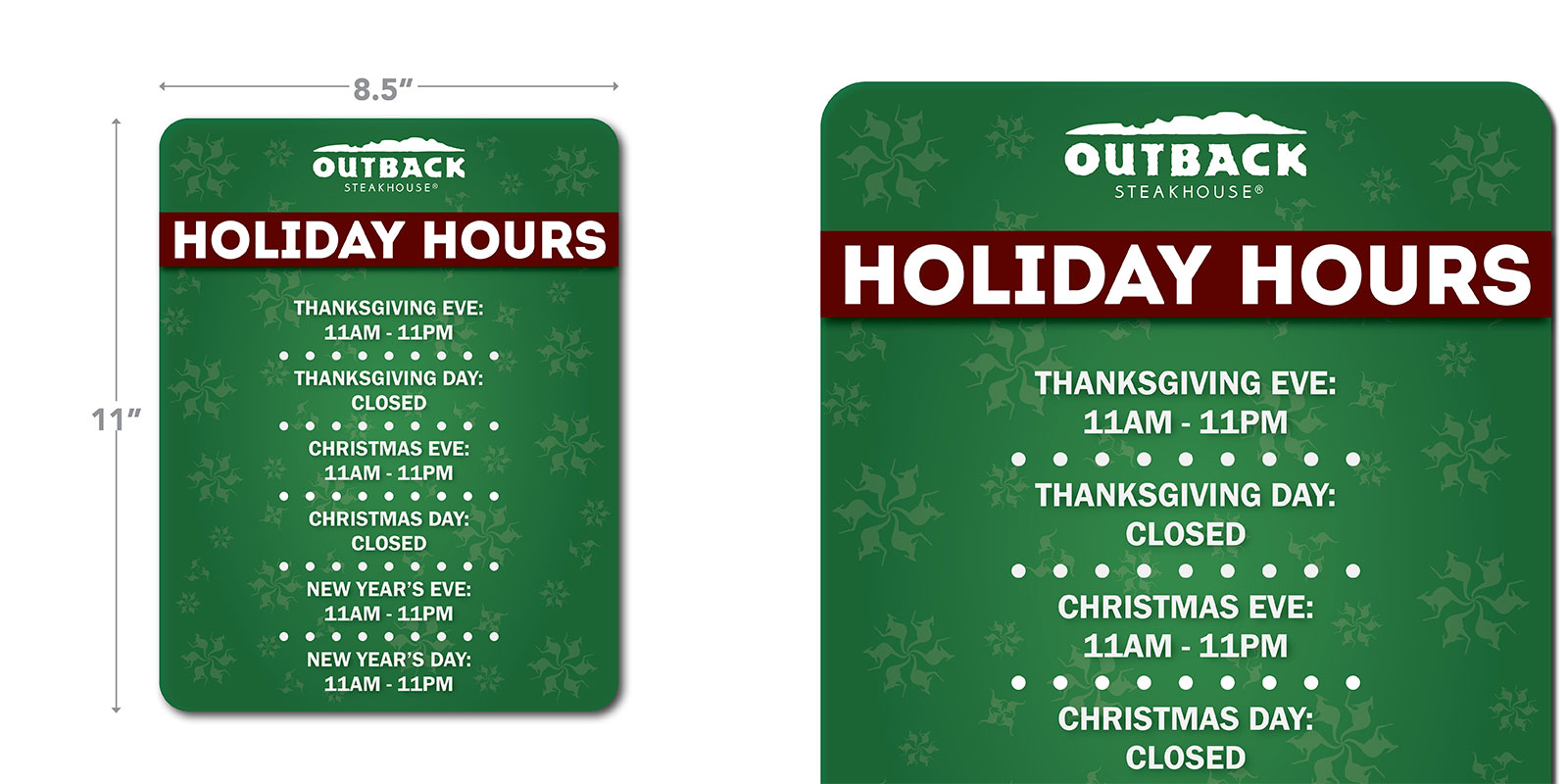 11″H x 8.5″W Holiday Hours Cling. Enter your custom holiday hours in the boxes provided on the right.