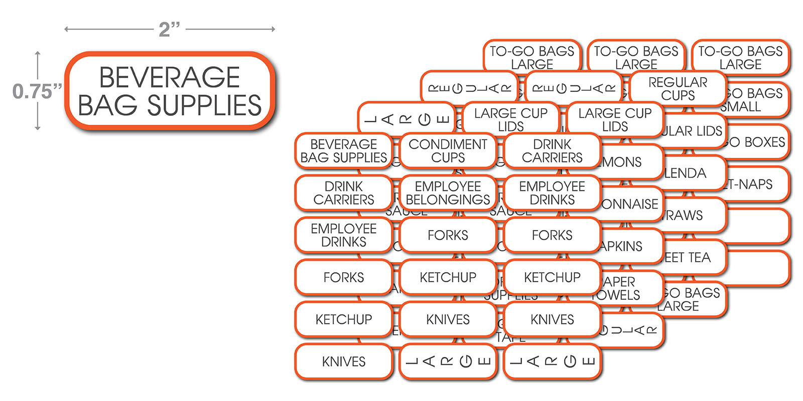 Set of 70 Beverage and Front Counter Labels. Each is 0.75″ H X 2″ W.