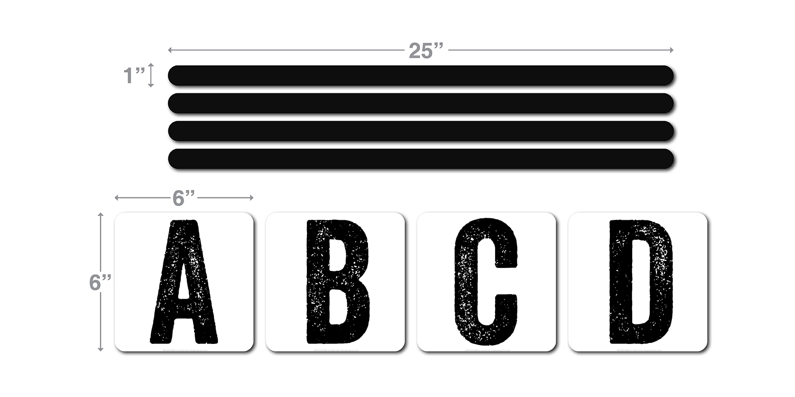 - 4 – 1″ H X 25″ W Marking Strip Decals