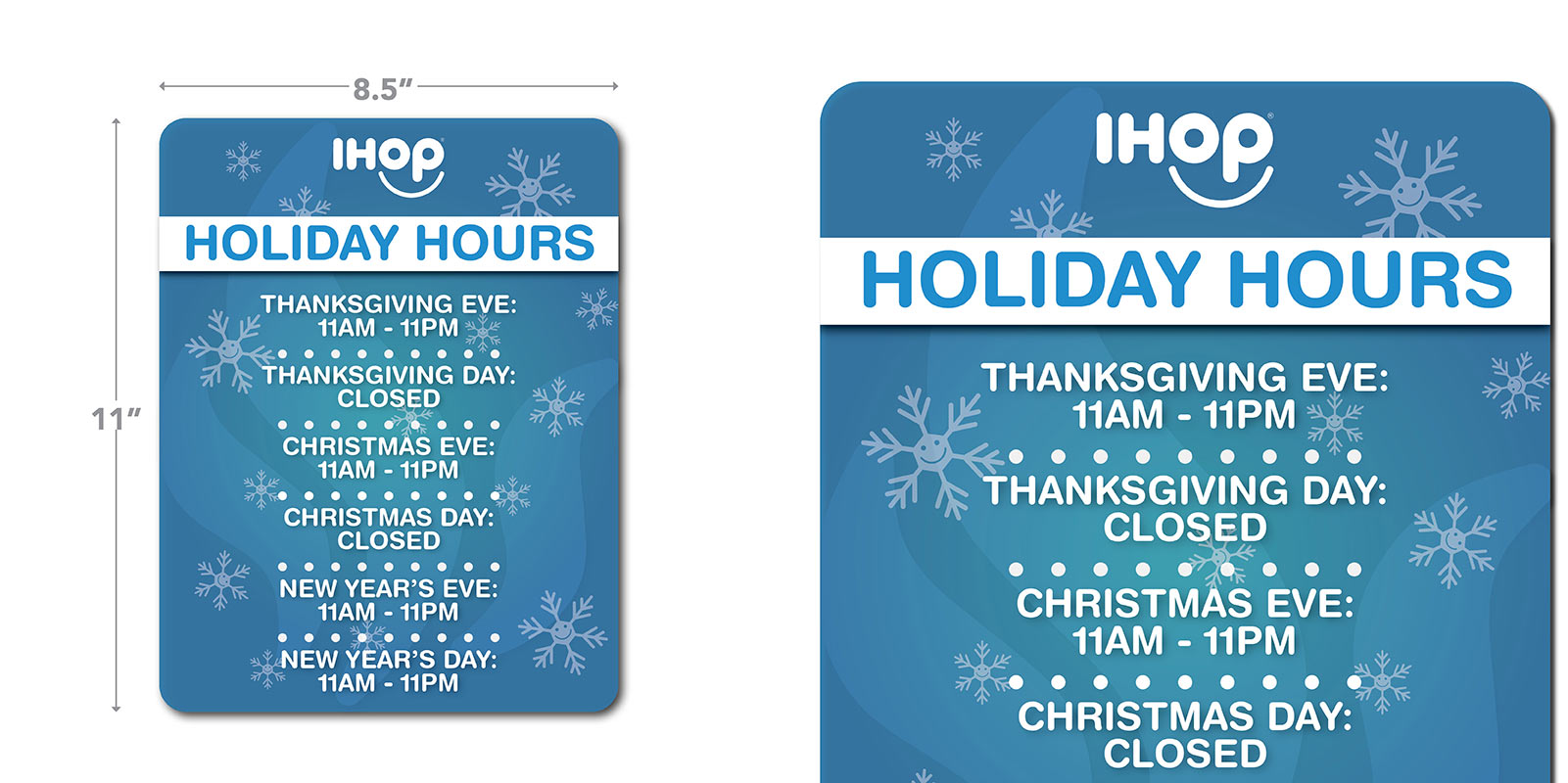 11″H x 8.5″W Holiday Hours Cling. Enter your custom holiday hours in the boxes provided on the right.
