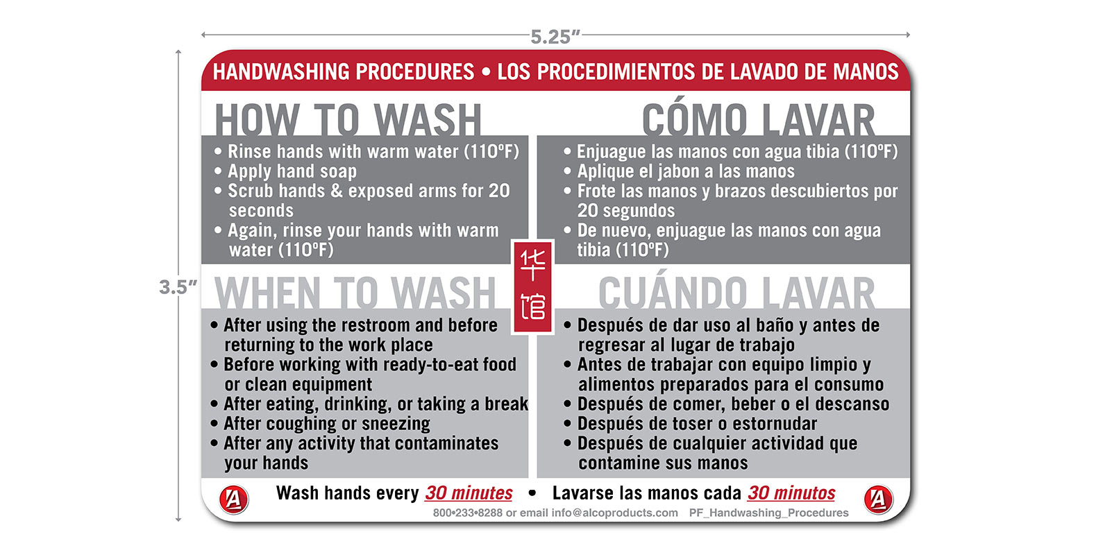 3.5″ x 5.25″ Bi-Lingual Handwashing Procedures Decal. Explains the standard procedure and outlines when employees are required to wash their hands.