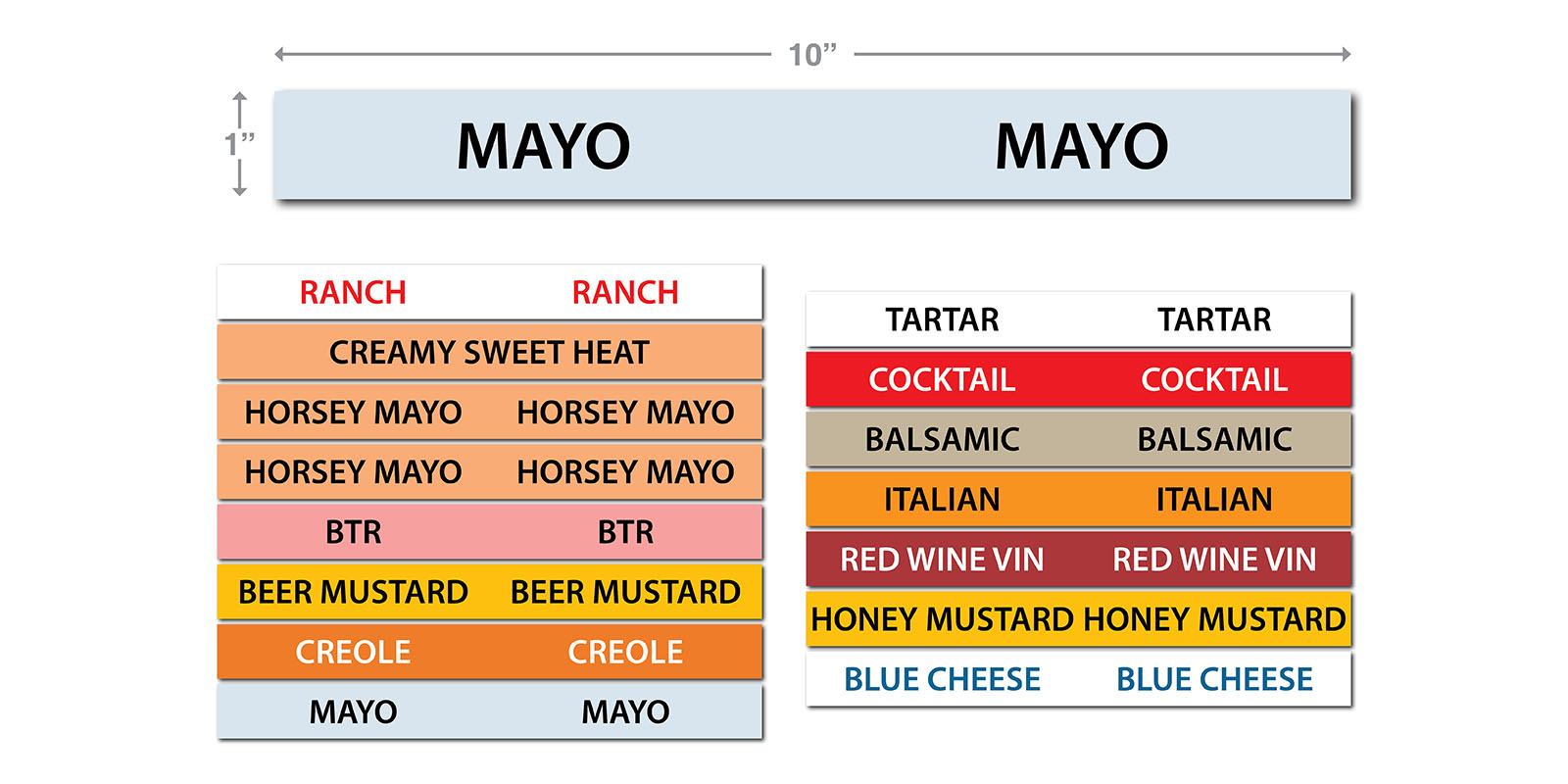Set of 15 Squeeze Labels for Dressings & Sauces. Each is 1″ H X 10″ W.