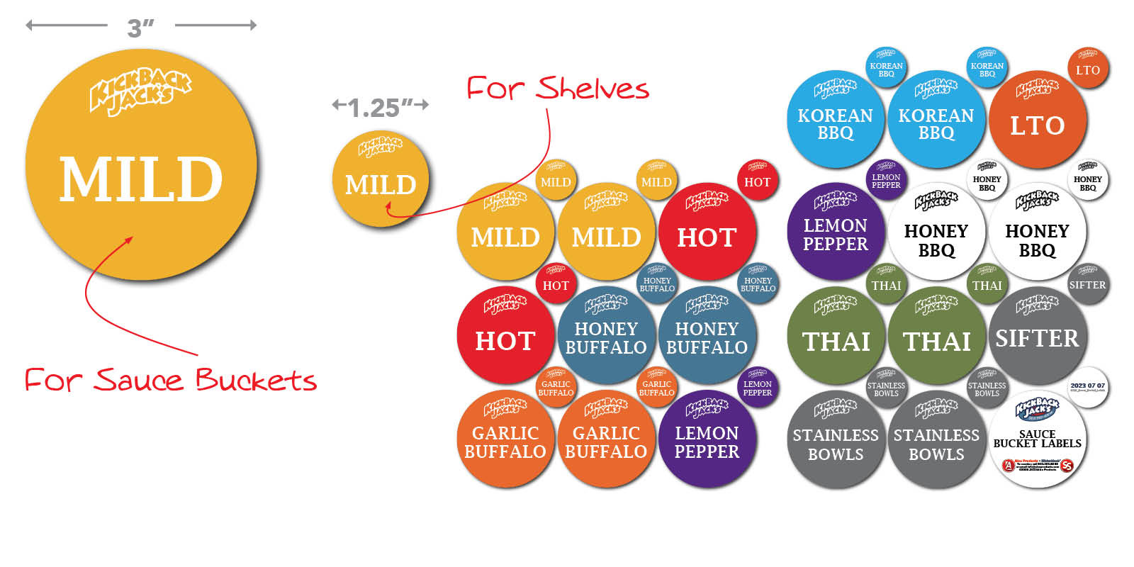 Sauce Bucket Labels. Set of 20 – 3″ diameter labels for the Sauce Buckets and 20 – 1.25″ diameter labels for the Shelves.