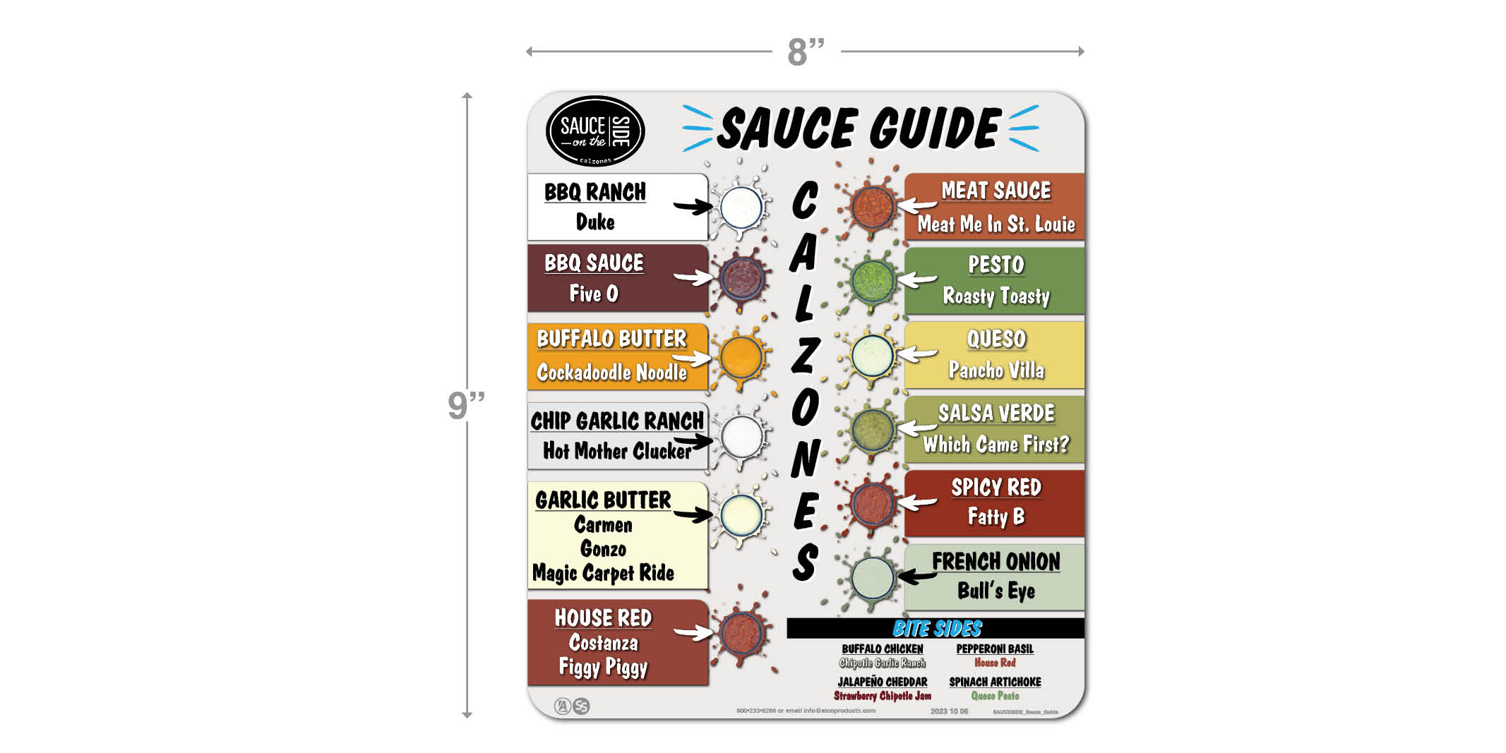 9″ H X 8″ W Sauce Guide Decal. Lists sauces for Calzones and Bite Sides with photos!