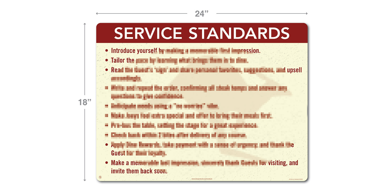 18″ H X 24″ W Service Standards Board. Our laminated vinyl on PVC with foam tape on the back for easy installation.