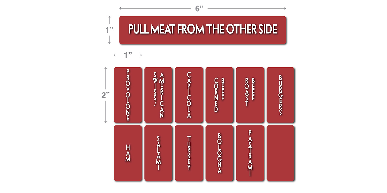 Speed Rack Labels. Set of 11 Vertical 2″ H X 1″ W and 1 1″ H X 6″ W Pull Meat Label.